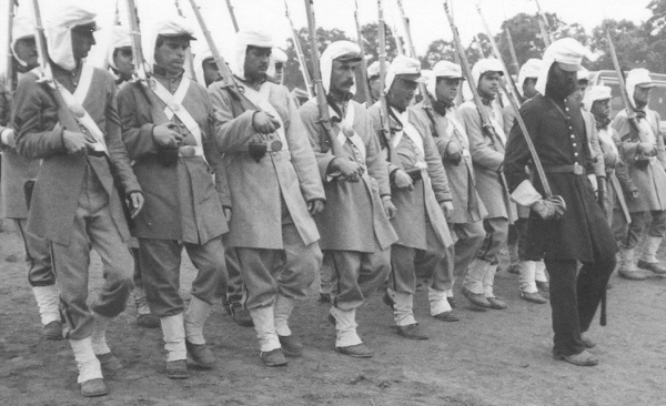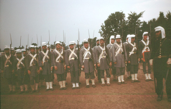 Bentonville, NC: David stands to left of stack on right. He would later please the crowd by wearing a bonnet as one of Sherman's Bummers;